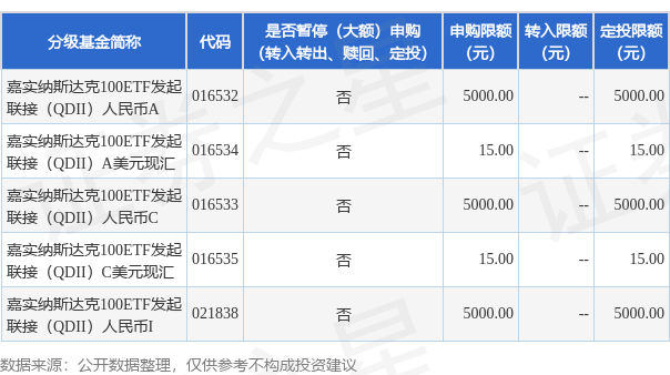 注:嘉实纳斯达克100ETF发起联接(QDII)人民币A、嘉实纳斯达克100ETF发起联接(QDII)人民币C、嘉实纳斯达克100ETF发起联接(QDII)人民币I:限制申购金额、限制定期定额投资金额:5000元人民币。嘉实纳斯达克100ETF发起联接(QDII)A美元现汇、嘉实纳斯达克100ETF发起联接(QDII)C美元现汇:限制申购金额、限制定期定额投资金额:15美元。